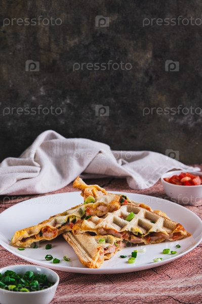 Тосты из вафли с ветчиной, сыром и томатами на тарелке на столе вертикальный вид