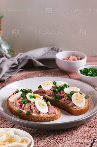 Вкусные бутерброды на зерновом хлебе с тунцом и перепелиным яйцем на тарелке на столе вертикальный вид