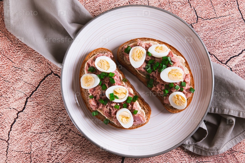 Близкий снимок бутербродов на зерновом хлебе с тунцом и перепелиным яйцем на тарелке на столе