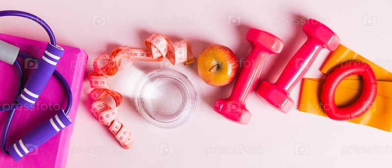 Стакан воды и яблоко для диеты и спортивное оборудование на столе верхний вид веб-баннер