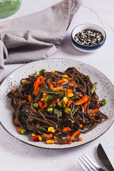 Буриная соба лапша с овощами на тарелке на столе вертикальный вид