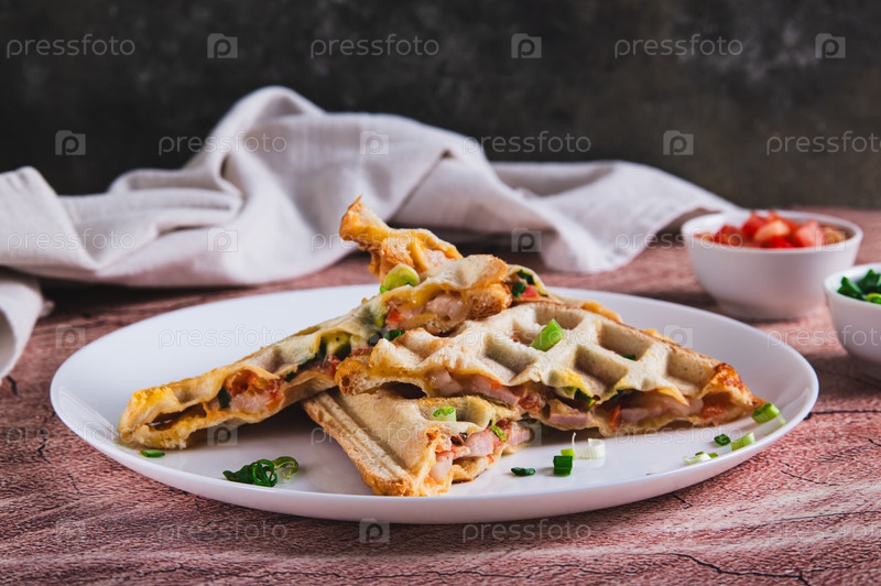 Гофревые тосты с ветчиной, сыром и помидорами заполняют тарелку на столе