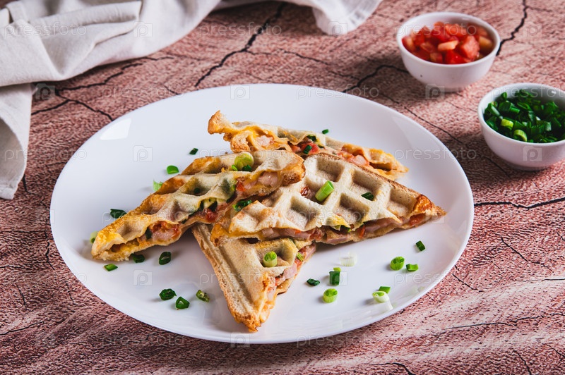 Бекон, сыр и помидоры выпечены в вафельном хлебе на тарелке на столе