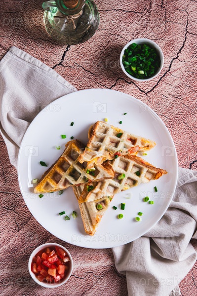 Бекон, сыр и помидоры выпечены в вафельном хлебе на тарелке сверху стола и вертикальный вид