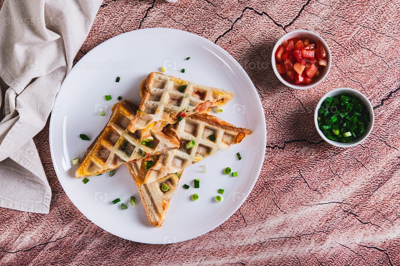 Тосты из вафли с ветчиной, сыром и томатами на тарелке на столе