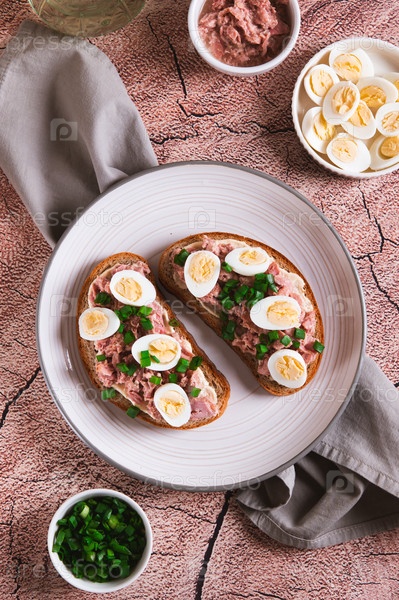 Брушетта с консервированным тунцом, вареным яйцем и зеленым луком на тарелке и вертикальным видом