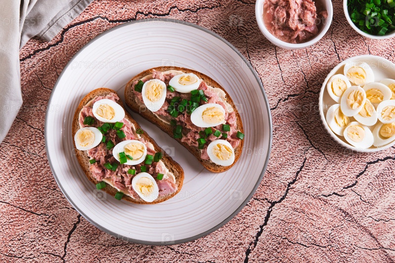 Вкусные бутерброды на зерновом хлебе с тунцом и перепелиным яйцем на тарелке на столе