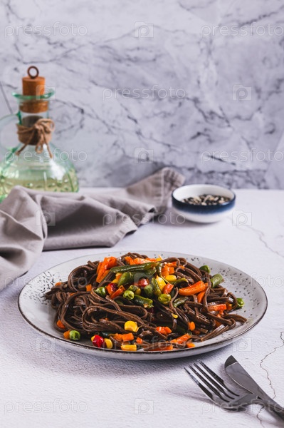 Вегетарианская соба с мексиканскими смешанными овощами на тарелке на столе вертикальный вид