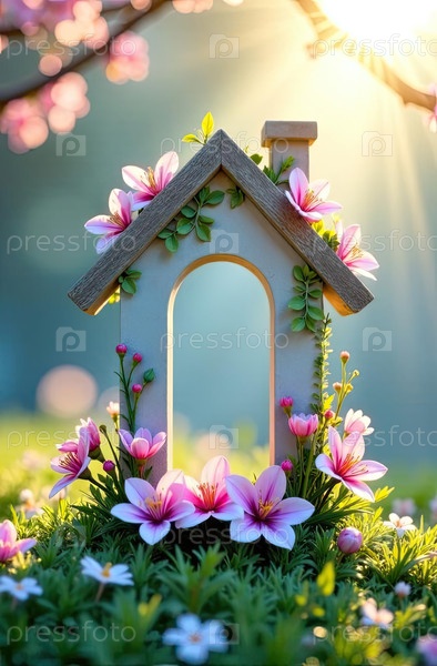 Дом с цветущими ромашками в саду, идиллическая весенняя недвижимость на продажу - для семей, аренды или баннера-приглашения