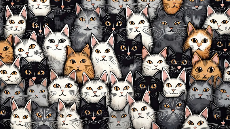 Crowded tabby-black cats seamless pattern ? стиль мультфильма, разнообразие пород, упаковка, домашнее постельное белье, дизайн питания для питомцев