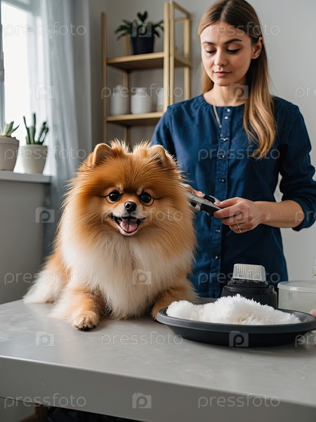Женщина, занимающаяся уборкой волос наряжает померанианский с помощью хлопковой шерсти - тщательный уход, уход за породой, чистое рабочее пространство, уютное освещение, стрижка меха