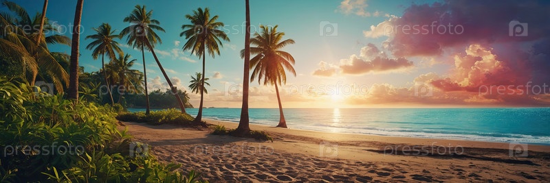Закат на экзотическом пляже с пальмами? дизайн рекламы путешествий, вдохновение для турагентства, веб-баннер, история, плакат