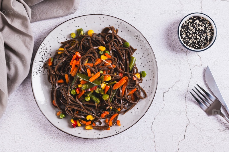 Вегетарианская соба с мексиканскими смешанными овощами на тарелке на столе