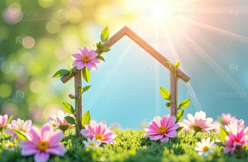Небольшой цветочный домик, весеннее предложение - продвижение недвижимости, покупка, аренда или продажа коттеджа