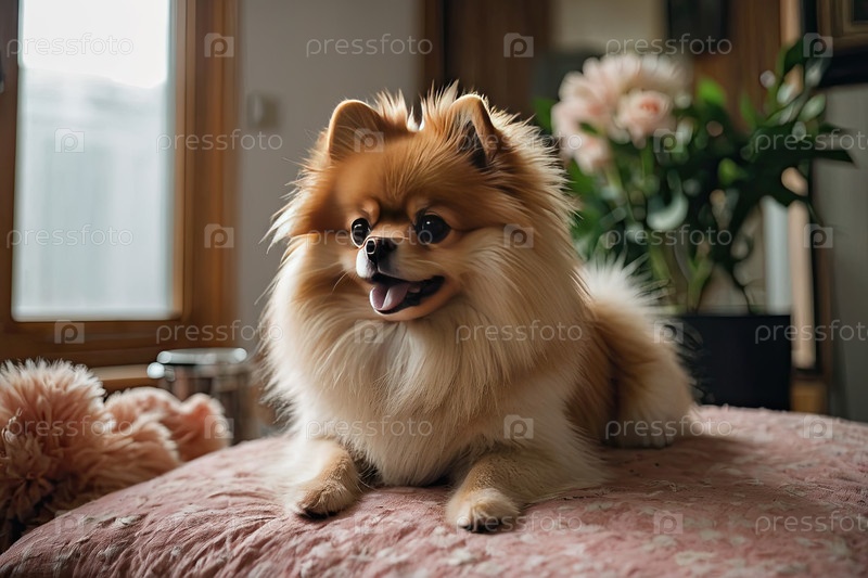 Помераньян, лежащий на одеяле ? после домашнего ухода за собой, мягкая шерсть, пушистый вид, отдых после чистки, уютный интерьер дома
