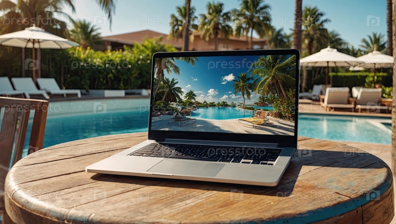 Круглый стол у тропического бассейна, ноутбук, голубая вода - отпускная работа, стабильный Wi-Fi, свобода местоположения, фрилансерский образ жизни, летняя реклама