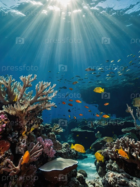 Вертикальная стена рифа, лучи солнечного света в чистой воде - морской туризм, дайвинг-экскурсии, безопасность под водой, эко-визуальное и биоразнообразие