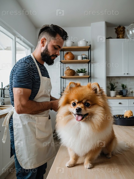 Помераньян и мужчина, занимающийся уходом за собой дома ? стрижка домашних животных, милая отделка, фартук для ухода, сеанс обрезки, современный декор, мягкий свет