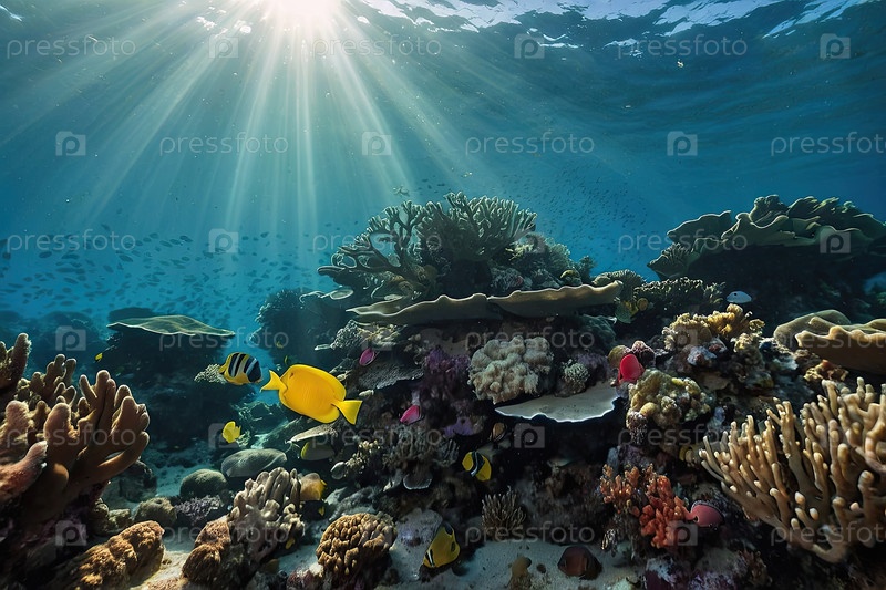Вида на коралловый риф, чистый голубой свет - образование по подводному туризму, приключения с сноркелингом, экологически чистый плакат, детальный подводный фон