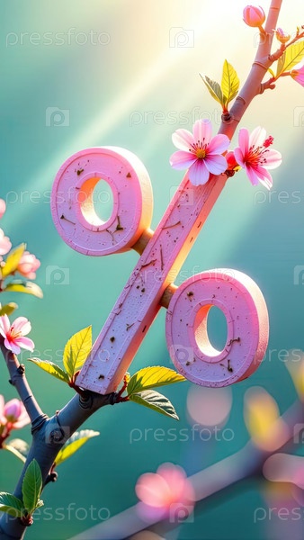 Вертикальный розовый процентный знак, цветущая ветвь ? весенняя скидка, цветная сделка, купон, эксклюзивная промо-акция, сбережения