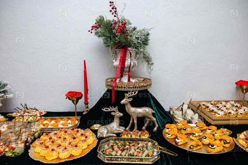 Стол с предварительными блюдами для рождественской вечеринки и праздничными украшениями