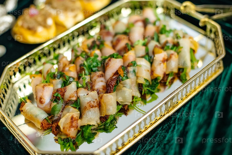 Сервирование гурманских закусок на элегантной золотой подносе для специального мероприятия