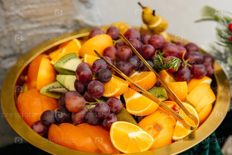 Тарелка свежих фруктов с виноградом апельсины киви подается на золотой подносе