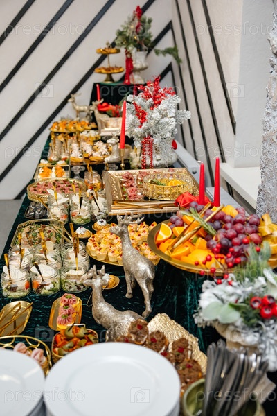 Рождественский праздничный буфетный стол, предлагающий праздничные закуски