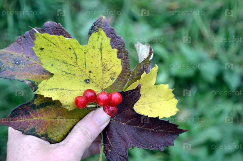 Листья калины и ягоды в руке осенью