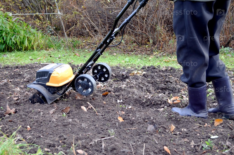 Пожилая женщина на даче рыхлит землю культиватором