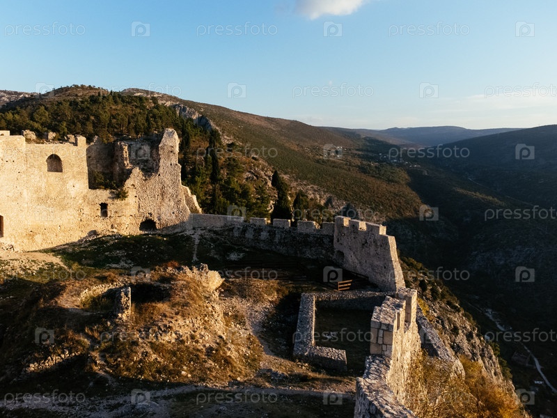Вид с воздуха Любушкинской крепости на скалистом холме при закате солнца, окруженный крутыми горами и лесистой долиной