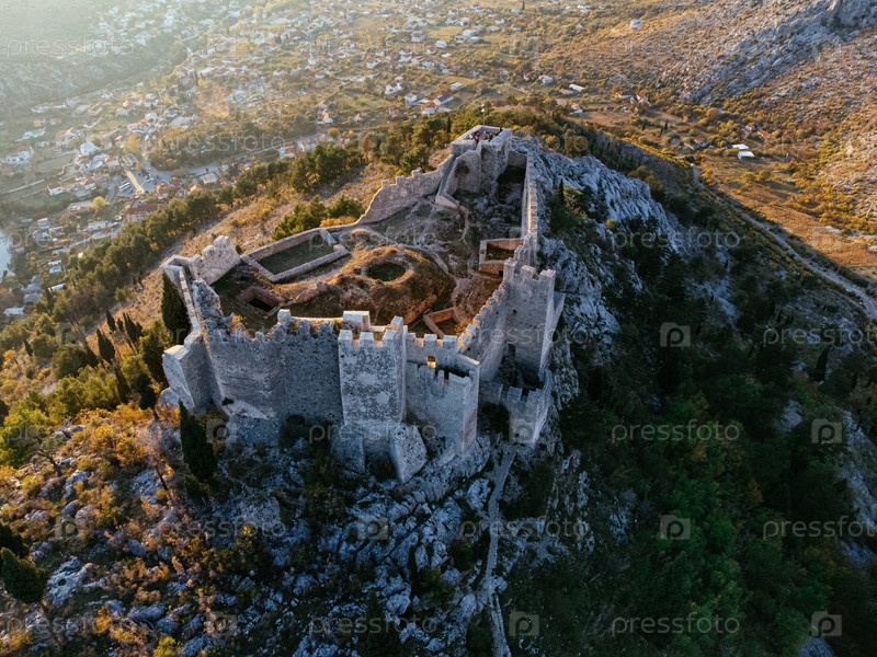 Вид с воздуха Любушкинской крепости на скалистом холме при закате солнца, окруженный крутыми горами и лесистой долиной
