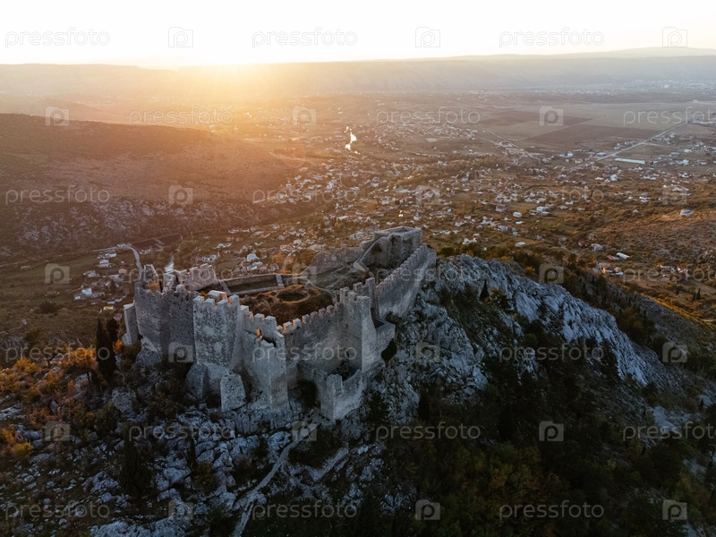 Вид с воздуха Любушкинской крепости на скалистом холме при закате солнца, окруженный крутыми горами и лесистой долиной