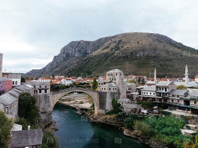 Вид с беспилотника на исторический старый Мостарский мост.Босния и Герцеговина, Европа