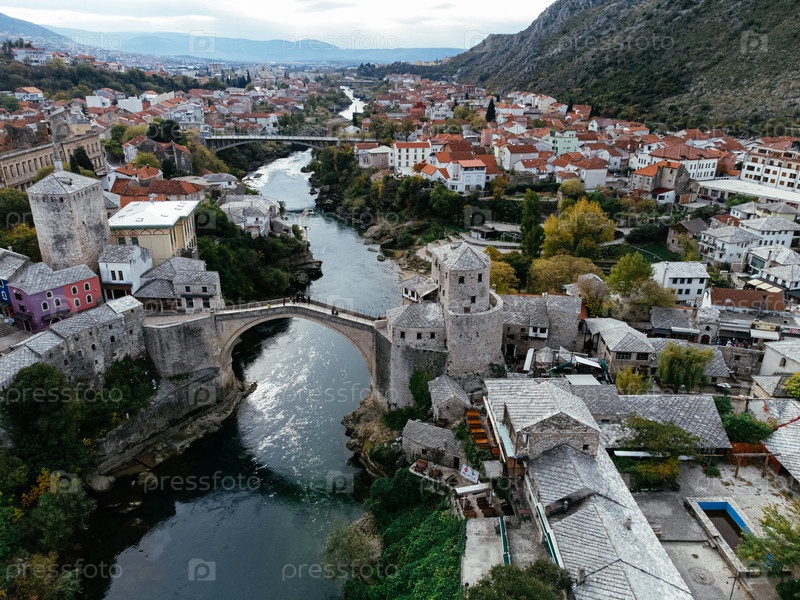 Вид с беспилотника на исторический старый мост Мостар.Босния и Герцеговина, Европа