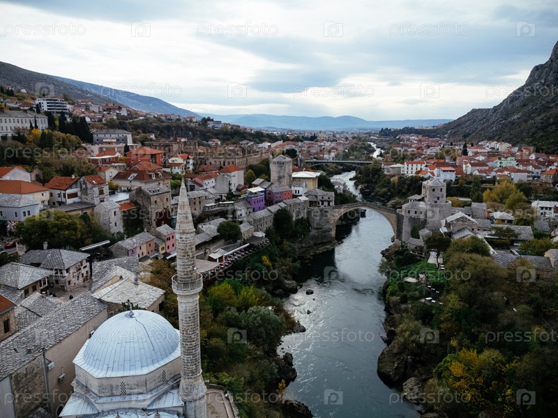 Вид с воздуха на город Мостар и реку Неретва, старый мост, мечеть Коски Мехмеда-паши