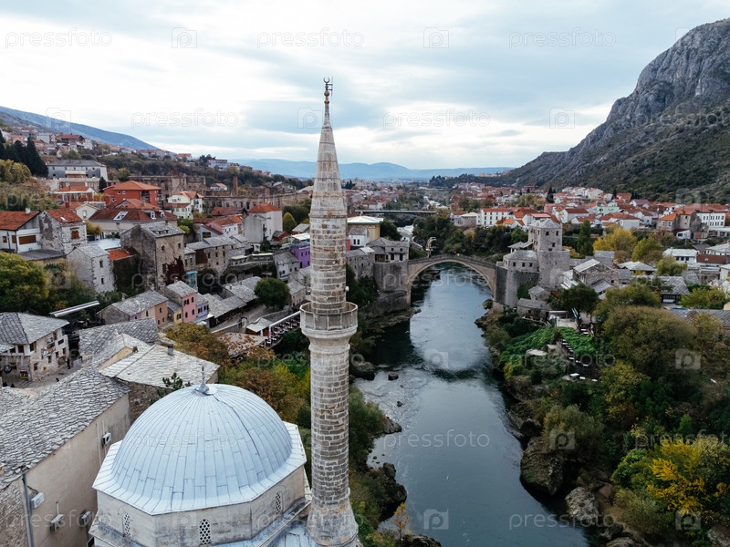 Вид с беспилотника на исторический старый мост Мостар.Босния и Герцеговина, Европа