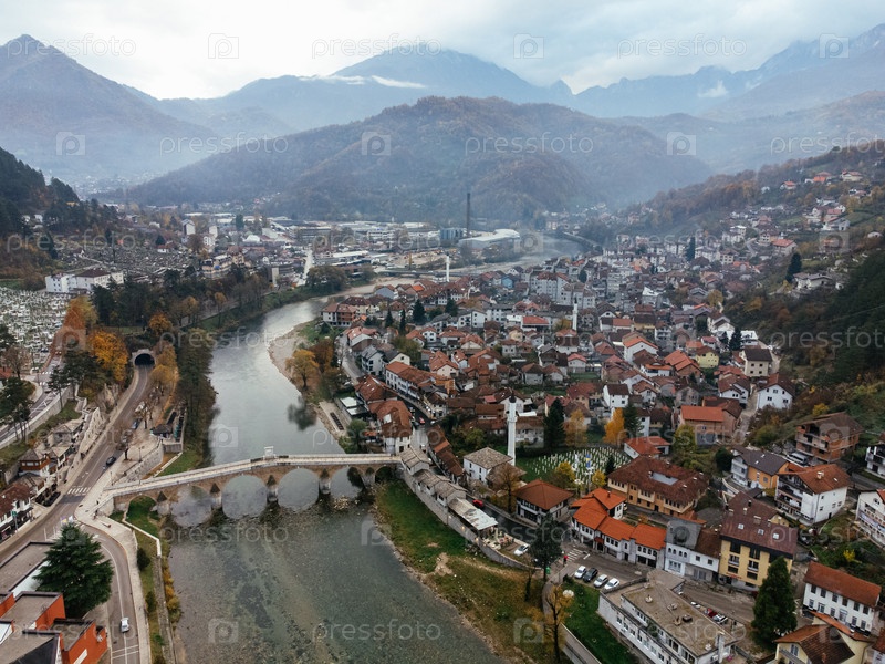 Вид с беспилотного летательного аппарата города Конжиц, моста и реки Неретва