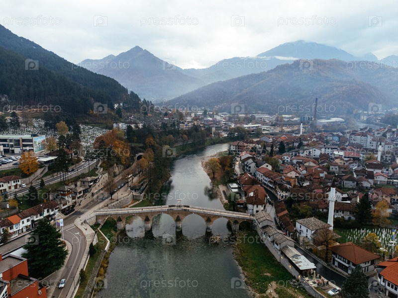 Вид с беспилотного летательного аппарата города Конжиц, моста и реки Неретва