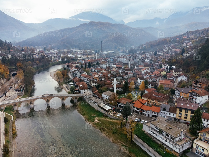 Вид с беспилотного летательного аппарата города Конжиц, моста и реки Неретва