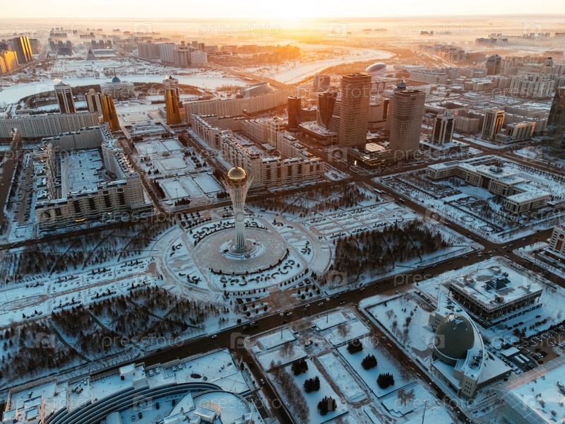 Панорама из воздуха городского горизонта Астаны зимой со снежными дорогами и современной архитектурой