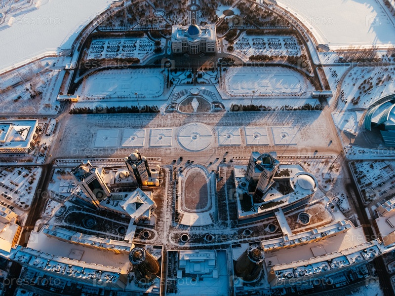 Панорама из воздуха городского горизонта Астаны зимой со снежными дорогами и современной архитектурой
