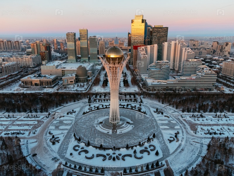 Вид с воздушного дрона Нур-Султан, Казахстан Центр города Казахстана с небоскребами и башней Байтерек