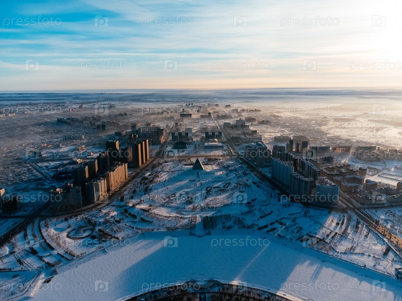 Вид с воздушного дрона Нур-Султан, Казахстан Центр города Казахстана с небоскребами и башней Байтерек