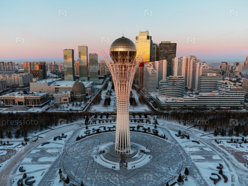 Вид с воздушного дрона Нур-Султан, Казахстан Центр города Казахстана с небоскребами и башней Байтерек