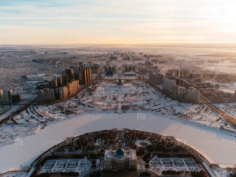 Панорама из воздуха городского горизонта Астаны зимой со снежными дорогами и современной архитектурой