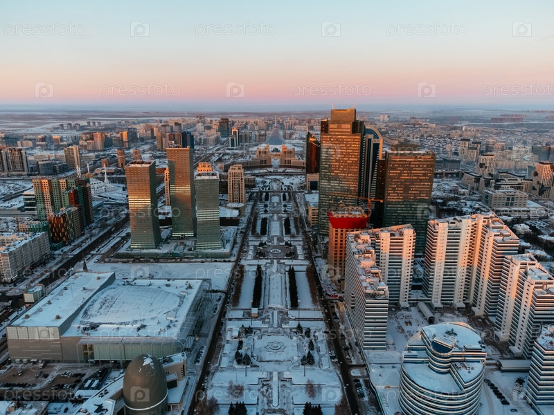 Панорама из воздуха городского горизонта Астаны зимой со снежными дорогами и современной архитектурой