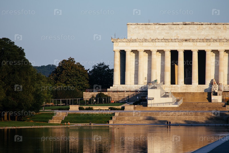 Мемориал Линкольна на восходе солнца, отражающийся в воде, Вашингтонский исторический памятник. c