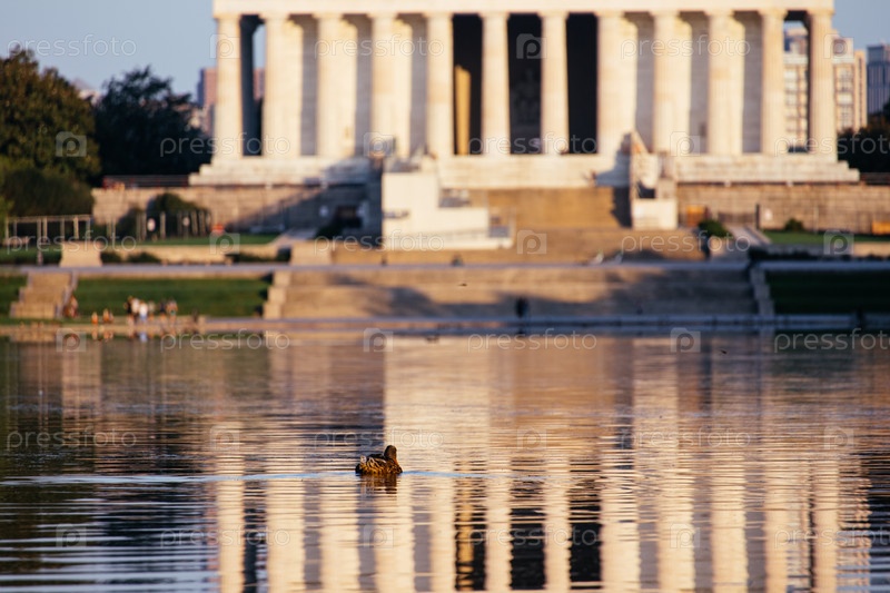 Мемориал Линкольна на восходе солнца, отражающийся в воде, Вашингтонский исторический памятник. c