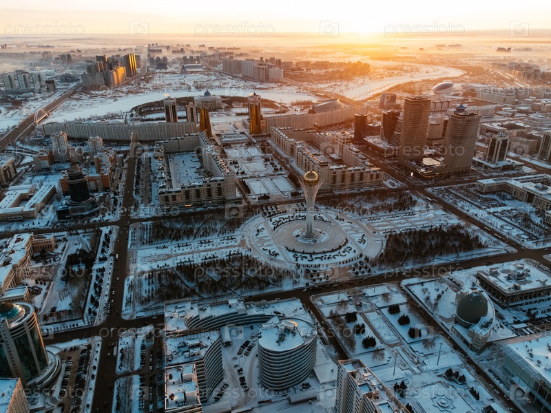 Вид с воздушного дрона Нур-Султан, Казахстан Центр города Казахстана с небоскребами и башней Байтерек